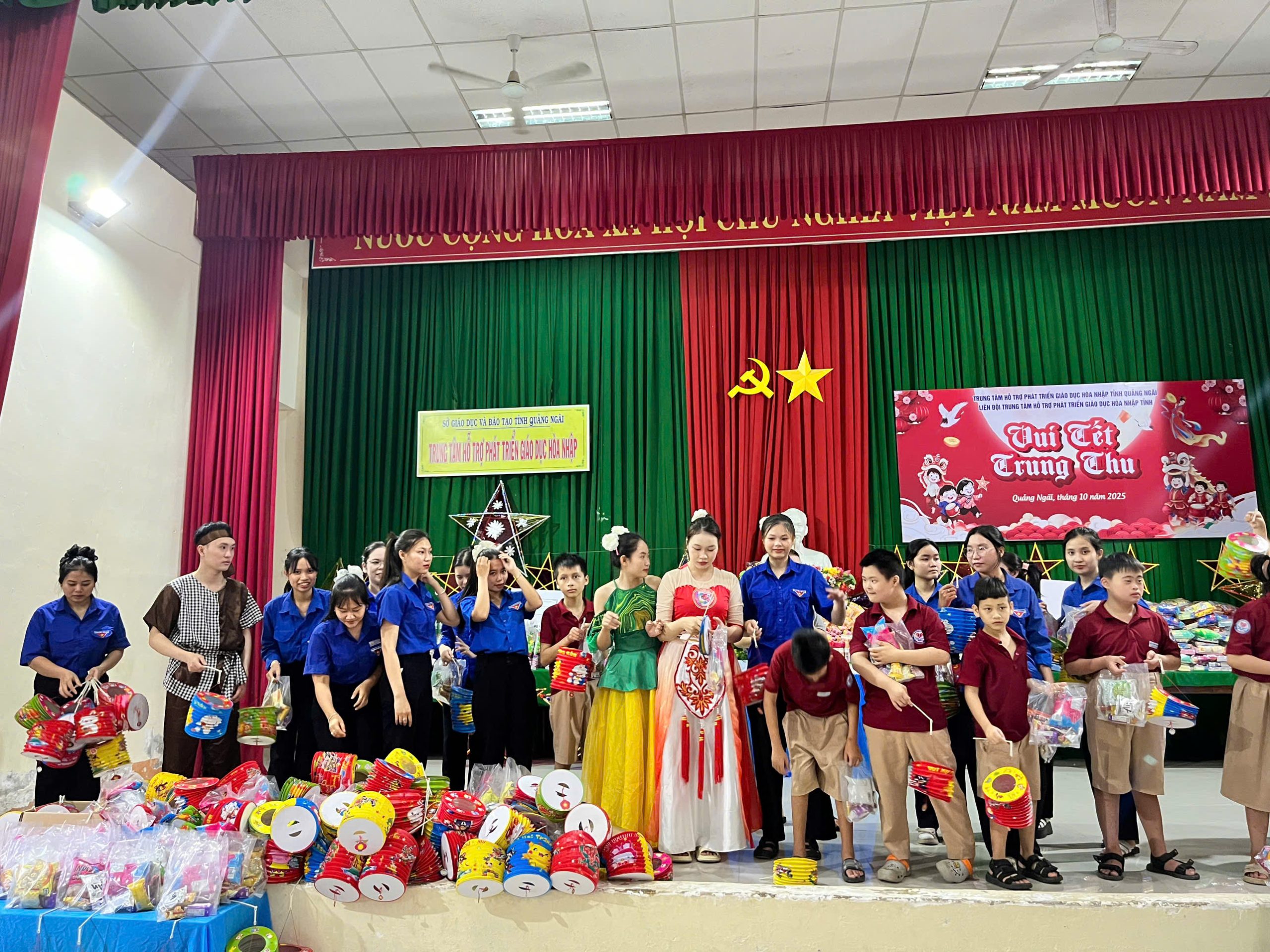 Chương trình diễn ra trong không khí sôi nổi, ấm áp với nhiều hoạt động phong phú: Các tiết mục văn nghệ do học sinh Trung tâm và các anh chị sinh viên Trường Cao đẳng Y tế Đặng Thùy Trâm biểu diễn; Màn múa lân sôi động do các anh chị CLB Let’s Do It Quảng Ngãi tài trợ; Và đặc biệt là phần trao tặng các phần quà Trung thu đến học sinh, cụ thể: Sở GD&ĐT Quảng Ngãi: 150 phần quà; Chi đoàn Trại tạm giam Công an Quảng Ngãi: 150 phần quà; Đoàn Trường Cao đẳng Y tế Đặng Thùy Trâm: 142 phần quà; Hội Cha mẹ học sinh Trung tâm: 150 phần quà và một mâm cỗ Trung thu; Cô Bùi Thị Kim Khánh: 11 suất quà (mỗi suất 200.000 đồng) dành cho 11 học sinh có hoàn cảnh khó khăn; 140 phần quà của Chùa Minh Đức và ca sĩ Thùy Hương.